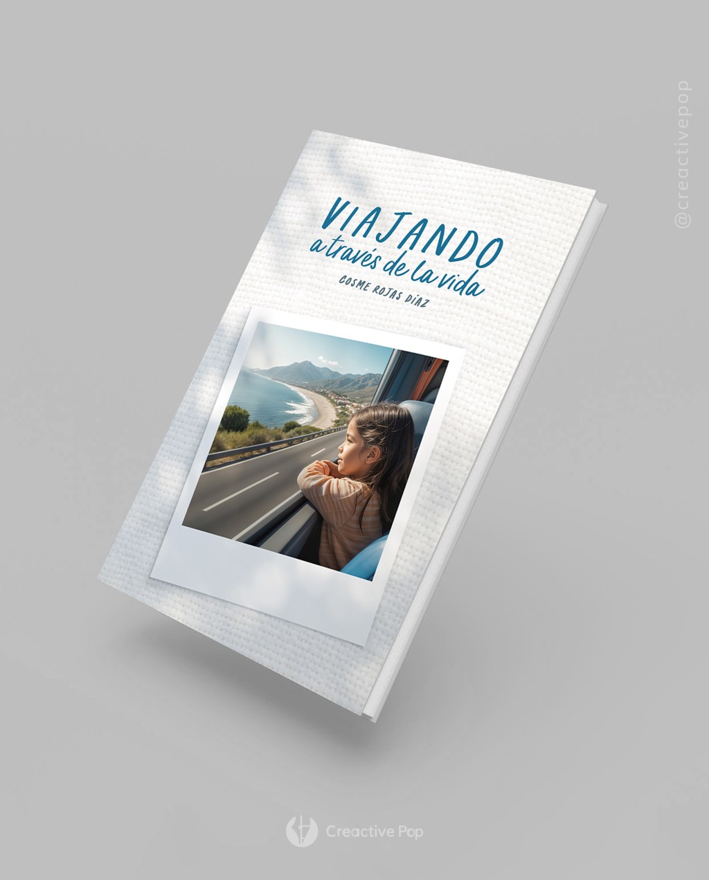 - “Portada: La imagen muestra una fotografía de Linda cuando era niña, recreando una escena de las páginas 16 y 17 del libro. En la imagen, Linda está viajando en autobús y observando el paisaje a través de la ventana con curiosidad y apertura hacia nuevas experiencias. Esta escena refleja la temática explorada en el libro. La fotografía instantánea se encuentra sobre un fondo texturizado que representa una mesa, y se puede apreciar una sutil sombra de un árbol. Estos elementos se han creado con el propósito de transmitir una sensación de tranquilidad, recuerdos positivos y la historia de generaciones familiares.